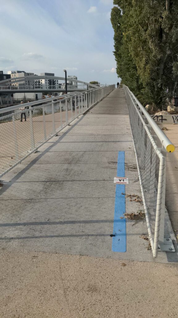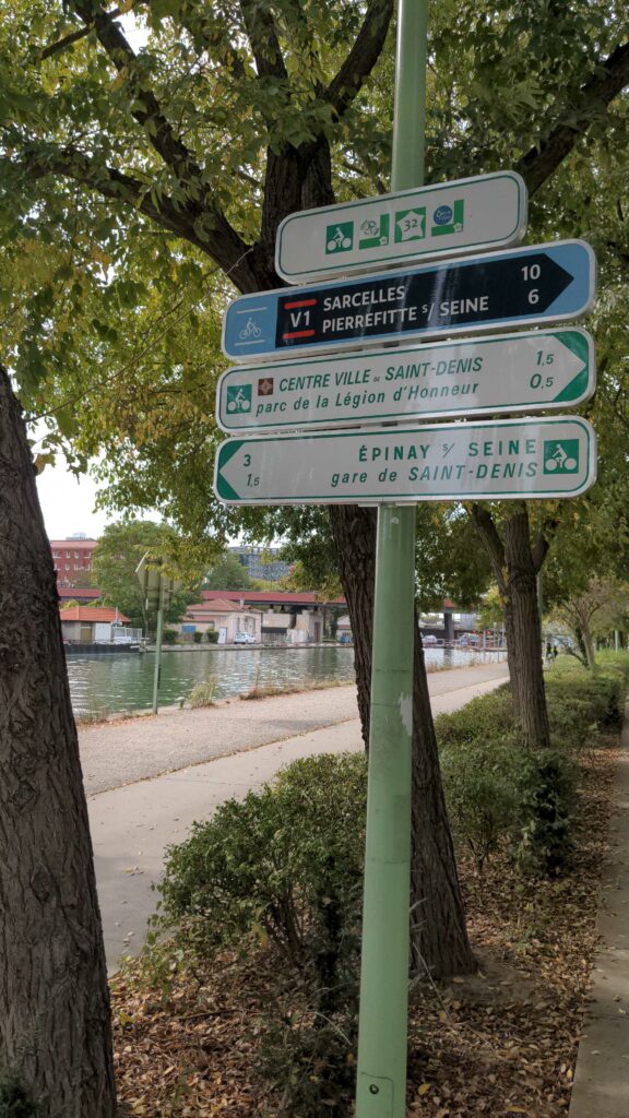 10 – Comme tout réseau, le VIF a également son jalonnement qui se met en place petit à petit. Après les premiers panneaux à Torcy en 2023, c’est Plaine Commune qui finalise sa portion de V1 nord avec un marquage au sol et vertical. Une étape de plus qui permet aux cyclistes de se repérer et de faire vivre le VIF dans l’espace public.