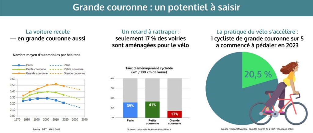 Les chercheurs sont clairs : là où la pratique est forte au centre, elle finit par croître en périphérie. La grande couronne est dans cette dynamique — à condition que les politiques s’en emparent pour l’accompagner et l’accélérer. Car en grande couronne d’Île-de-France, seulement 17 % des voiries sont aujourd’hui aménagées pour le vélo, contre 39 % à Paris et 41 % en petite couronne. Ce retard est réel — mais il n’est pas une fatalité. C’est un potentiel à saisir.